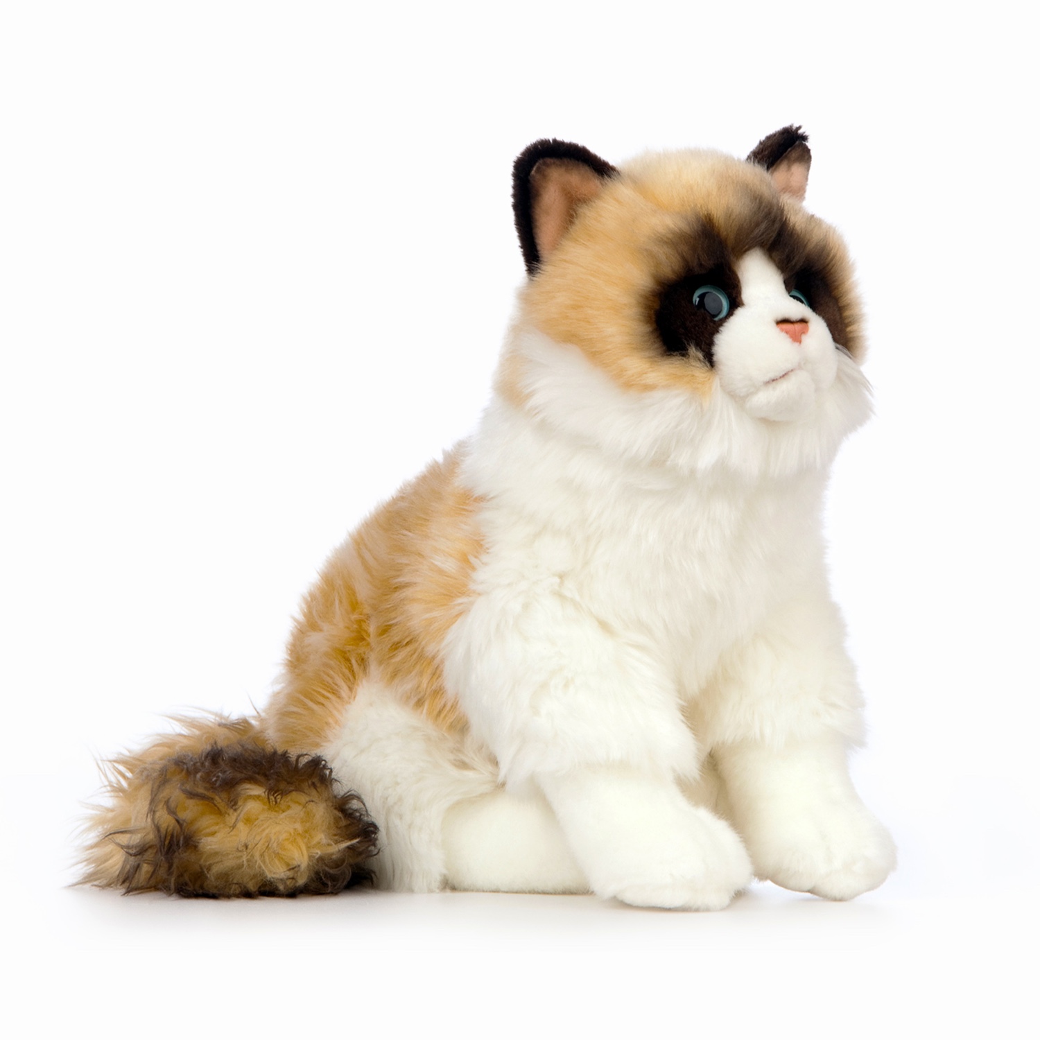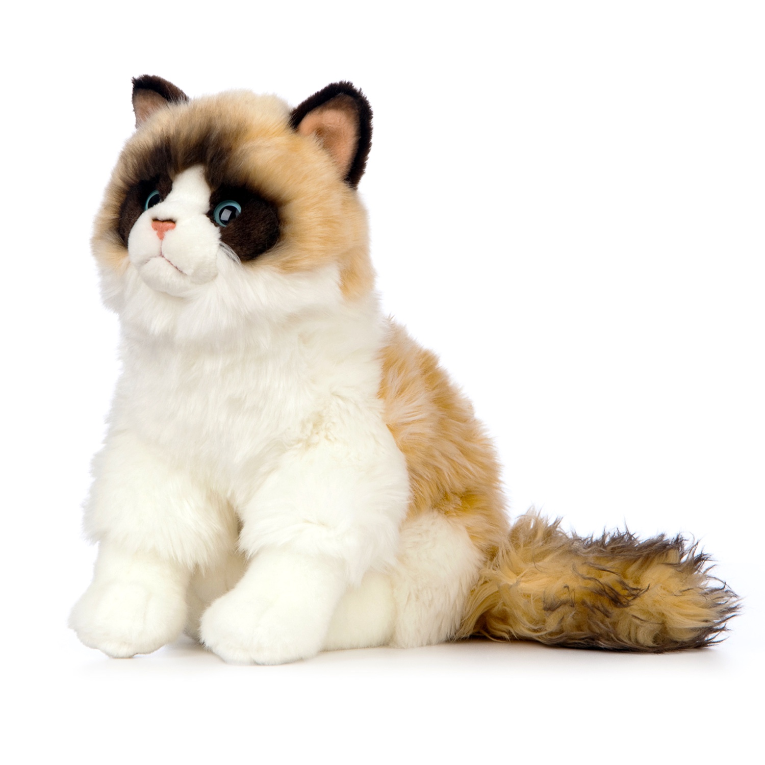 Dieses Ragdoll-Katzenplüschtier wurde so entworfen, dass es die schönen Eigenschaften der Rasse zeigt: grosse blaue Augen, ein liebenswertes Gesicht und ein flauschiges Fell – perfekt zum Kuscheln.